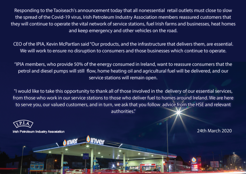 “Our products, and the infrastructure that delivers them, are essential. We will work to ensure no disruption… Petrol and diesel will still flow, home heating oil and agricultural fuel will be delivered, and our service stations will remain open”. – IPIA statement Friday 27th March