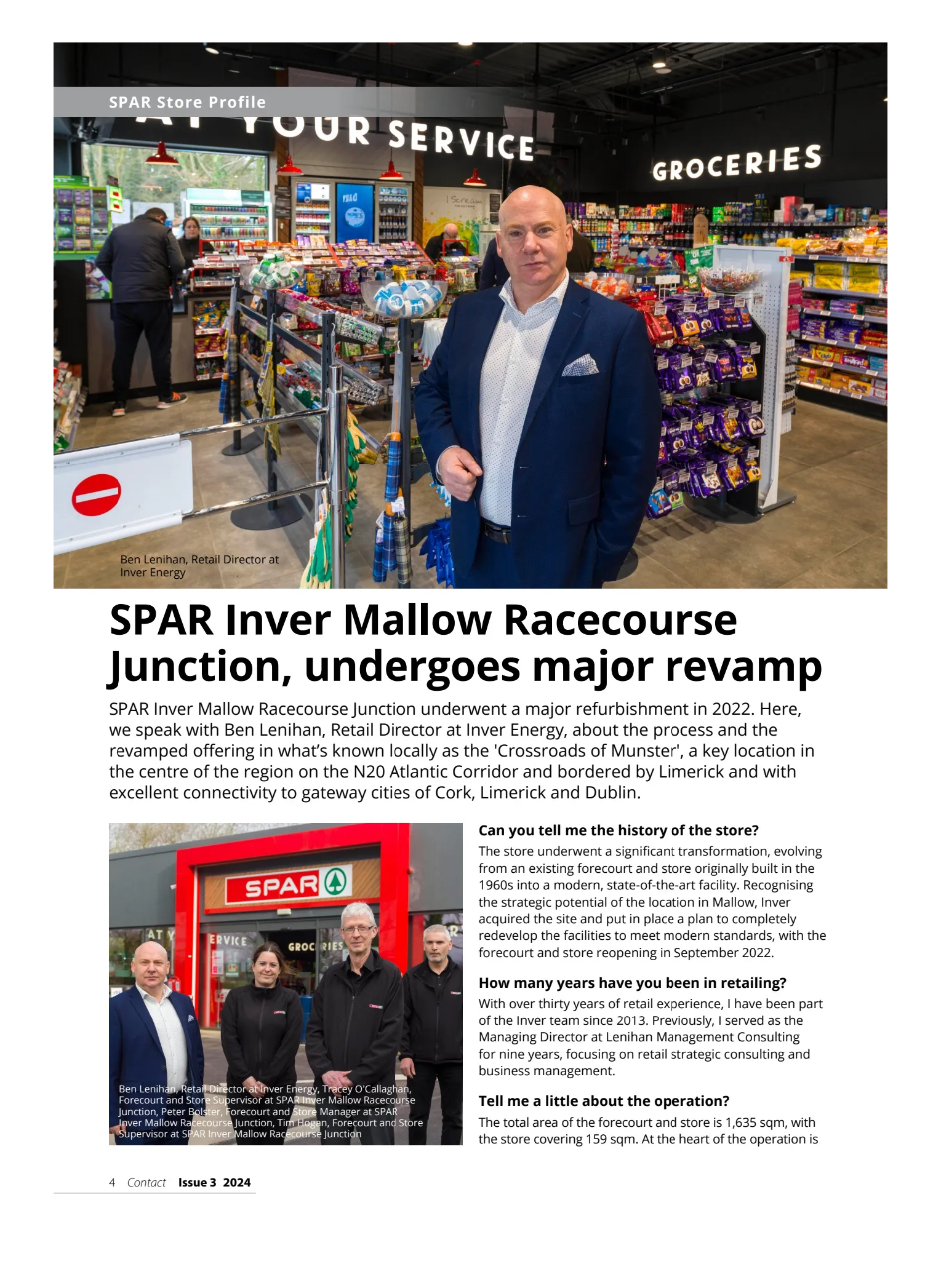 SPAR Inver Mallow Racecourse Junction underwent a major refurbishment in 2022. SPAR Contact Magazine speaks with Ben Lenihan, Retail Director at Inver Energy, about the process and the revamped offering in what’s known locally as the ‘Crossroads of Munster’, a key location in the centre of the region on the N20 Atlantic Corridor and bordered by Limerick and with excellent connectivity to gateway cities of Cork, Limerick and Dublin.